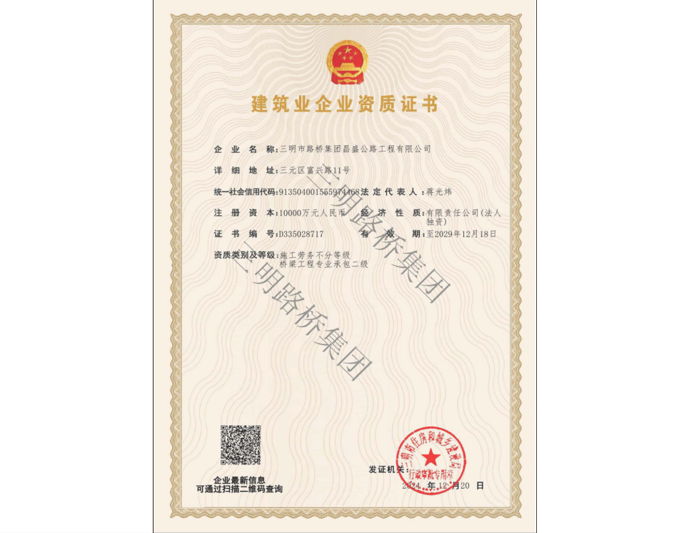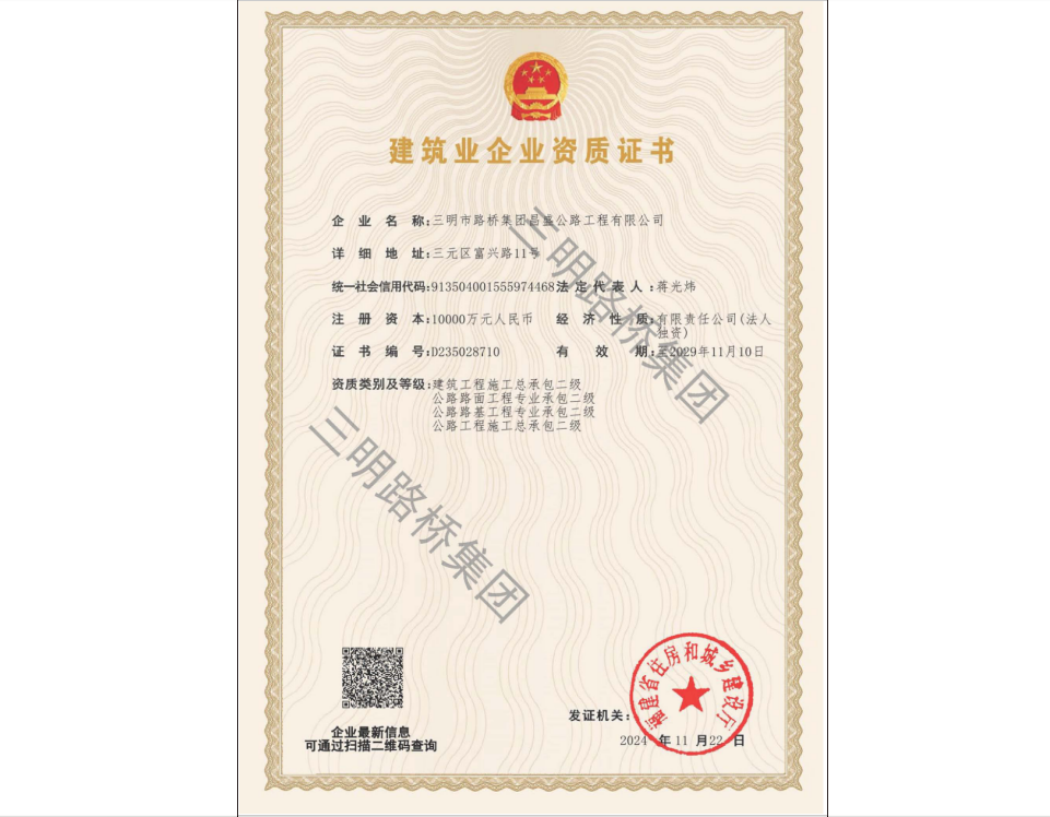 建筑工程施工總承包二級(jí)、公路路面工程專業(yè)承包二級(jí)、公路路基工程專業(yè)承包二級(jí)、