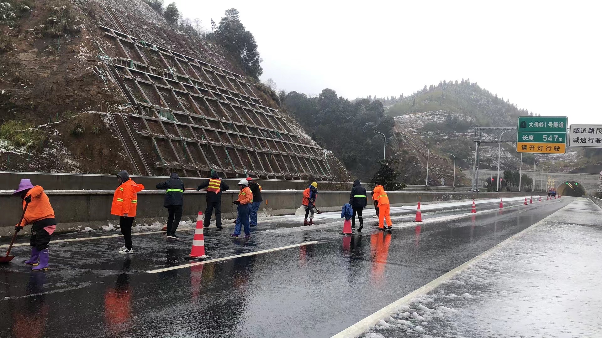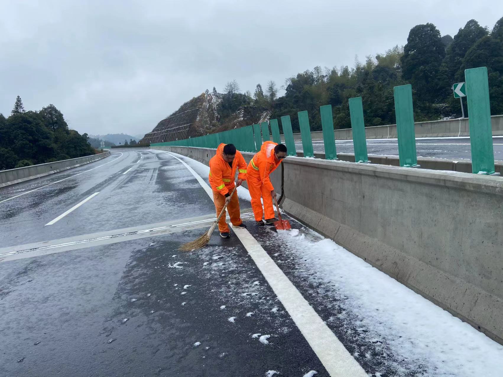 在保暢工作中,養(yǎng)護(hù)人員是抗冰除雪大軍中一面最亮眼的旗幟,他們與冰雪奮戰(zhàn),與時(shí)間賽跑,哪里有困難,他們就到哪里;盡管寒風(fēng)刺骨,汗水卻早已濕透了他們的衣衫,盡管腳穿雨靴,冰冷的雪水依然“侵蝕”著雙腳,但那一抹耀眼的橘色,儼然已成為高速路上最美的風(fēng)景。