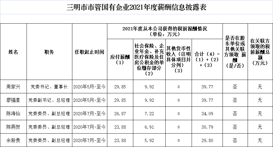 根據(jù)市國(guó)資委薪酬披露通知要求,現(xiàn)將我司企業(yè)負(fù)責(zé)人2021年度薪酬在公司官網(wǎng)進(jìn)行公開(kāi)披露,接受社會(huì)公眾監(jiān)督。具體詳見(jiàn)下表: