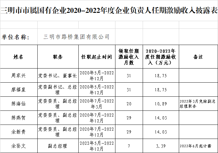 三明市路橋集團有限公司2020-2022年度企業(yè)負責(zé)人任期激勵收入披露