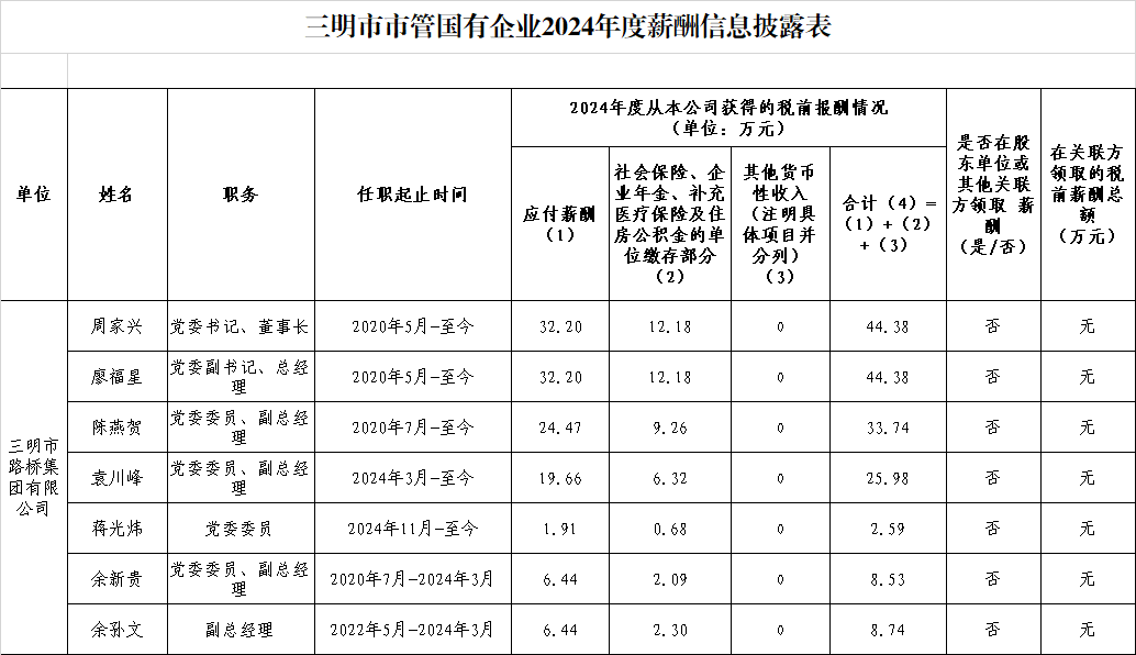 三明市路橋集團有限公司2024年度企業(yè)負(fù)責(zé)人薪酬信息披露