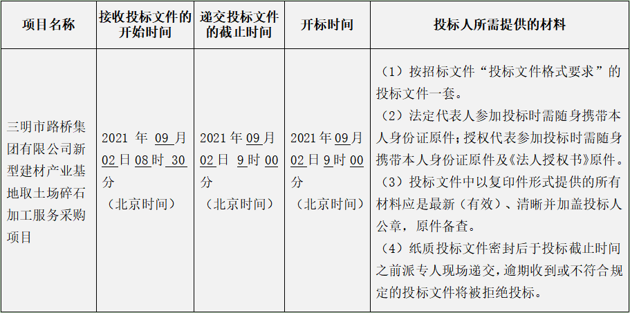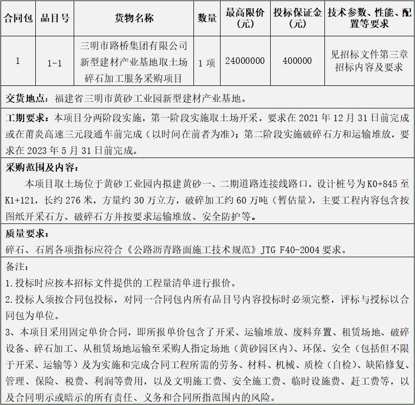 本公司受三明市路橋集團(tuán)有限公司的委托,就其所需的三明市路橋集團(tuán)有限公司新型建材產(chǎn)業(yè)基地取土場碎石加工服務(wù)采購項(xiàng)目進(jìn)行公開招標(biāo),歡迎符合條件的供應(yīng)商參加投標(biāo)。