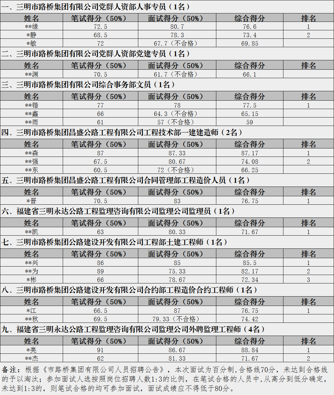 根據(jù)《市路橋集團(tuán)有限公司人員招聘公告》,現(xiàn)將市路橋集團(tuán)有限公司公開招聘工作人員綜合成績及排名情況公示如下: