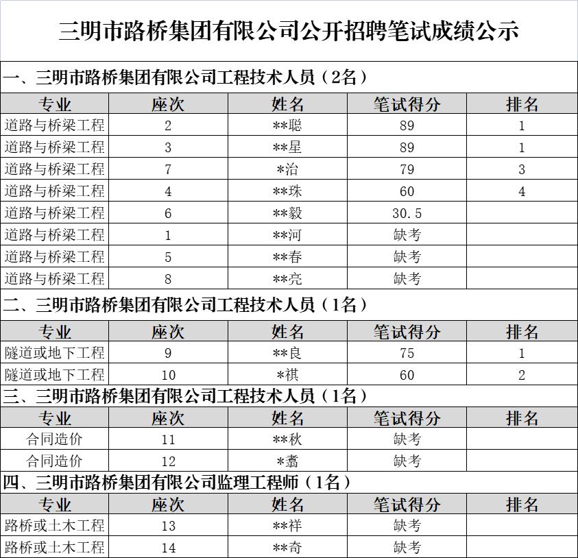 市路橋集團公開招聘筆試環(huán)節(jié)已于2022年7月20日完成,現(xiàn)將筆試成績予以公示: