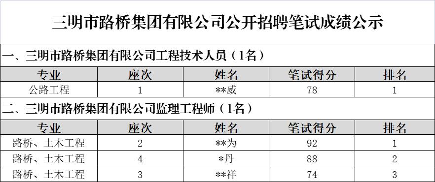 市路橋集團(tuán)公開招聘筆試環(huán)節(jié)已于2022年8月23日完成,現(xiàn)將筆試成績予以公示: