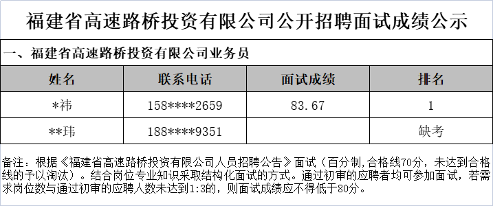 根據(jù)《省高速路橋投資有限公司人員招聘公告》,現(xiàn)將省高速路橋投資有限公司公開招聘工作人員面試成績(jī)及排名情況公示如下: