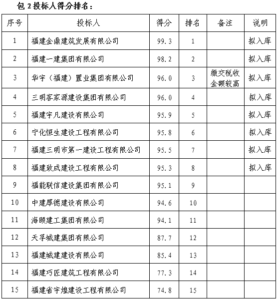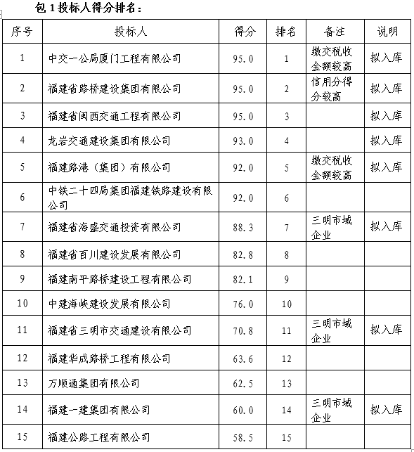 評標(biāo)委員會對通過資格審查的各合格投標(biāo)人,按合同包根據(jù)遴選文件規(guī)定進(jìn)行評分。各投標(biāo)人經(jīng)評標(biāo)委員會綜合分析、比較,在全部滿足遴選文件實(shí)質(zhì)性要求前提下,按得分從高到低的順序進(jìn)行排名,排名最高的前8名投標(biāo)人將被推薦為相應(yīng)合同包的入庫候選人;具體為:包1為公路工程類,排名前3名的三明市域企業(yè)和三明市域企業(yè)外排名前5名的企業(yè)入庫。包2為房建工程類,排名前8名的三明市域企業(yè)入庫;若企業(yè)得分相同,則以企業(yè)信用分得分高的排名優(yōu)先。再相同的,依次以業(yè)績得分、資質(zhì)得分、繳交稅收金額高的排名優(yōu)先。