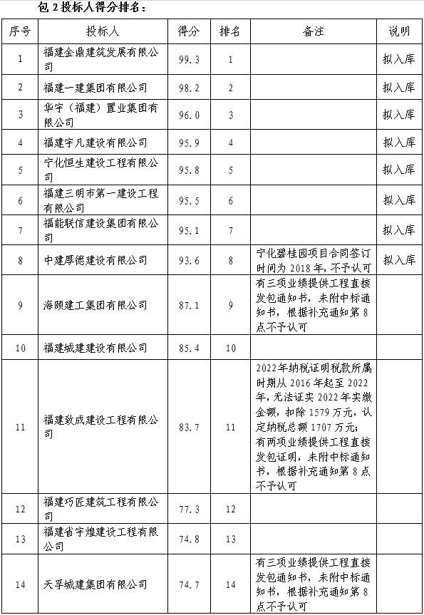 評標(biāo)委員會對通過資格審查的各合格投標(biāo)人,按合同包根據(jù)遴選文件規(guī)定進(jìn)行評分。各投標(biāo)人經(jīng)評標(biāo)委員會綜合分析、比較,在全部滿足遴選文件實質(zhì)性要求前提下,按得分從高到低的順序進(jìn)行排名,排名最高的前8名投標(biāo)人將被推薦為相應(yīng)合同包的入庫候選人;具體為:包2為房建工程類,排名前8名的三明市域企業(yè)入庫;若企業(yè)得分相同,則以企業(yè)信用分得分高的排名優(yōu)先。再相同的,依次以業(yè)績得分、資質(zhì)得分、繳交稅收金額高的排名優(yōu)先。