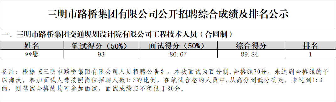 根據(jù)在三明市人力資源和社會(huì)保障局、三明市人民政府國(guó)有資產(chǎn)監(jiān)督管理委員會(huì)、三明市殘疾人聯(lián)合會(huì)聯(lián)合辦法的2025年三明市“職通未來(lái)?才聚三明”專(zhuān)場(chǎng)招聘會(huì)上發(fā)布招聘公告,現(xiàn)將市路橋集團(tuán)有限公司公開(kāi)招聘工作人員綜合成績(jī)及排名情況公示如下: