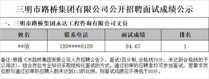 三明市路橋集團(tuán)有限公司項(xiàng)目用工人員招聘面試環(huán)節(jié)已于2025年7月23日完成,現(xiàn)將面試成績予以公示:
