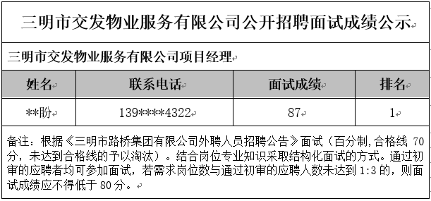 市交發(fā)物業(yè)服務(wù)有限公司公開招聘面試環(huán)節(jié)已于2025年9月5日完成,現(xiàn)將面試成績予以公示: