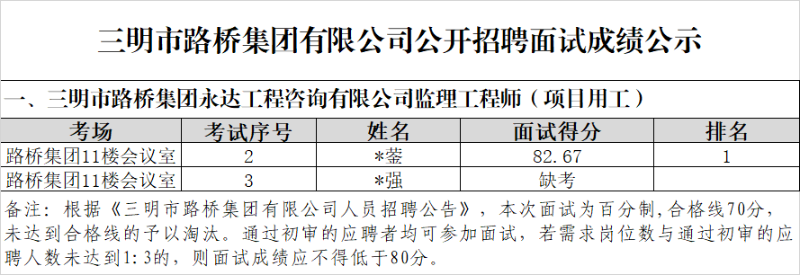 根據(jù)《三明市路橋集團(tuán)有限公司人員招聘公告》,現(xiàn)將市路橋集團(tuán)有限公司公開(kāi)招聘工作人員綜合成績(jī)及排名情況公示如下: